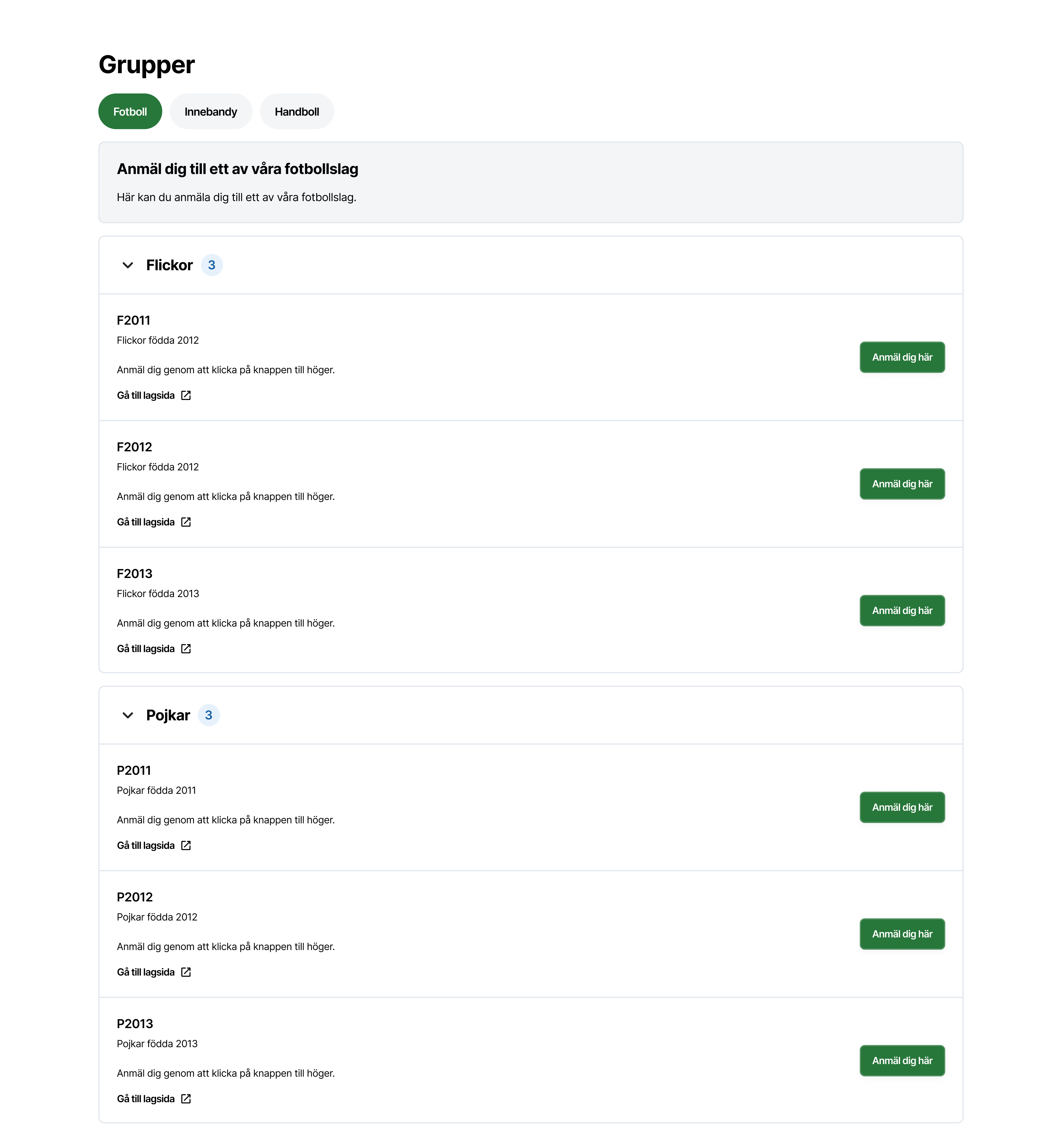 Om ni är en flersektionsförening kan ni välja vilka sektioner eller grupptyper som ska synas på er anmälningssida. Detta så er anmälningssida blir mer välorganiserad och att era medlemmar enkelt kan hitta till era olika grupper.